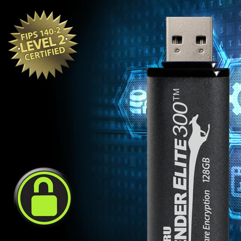 The Kanguru Defender Elite300™ SuperSpeed USB 3.0 secure flash drive is designed for high data security organizations looking to meet the most demanding regulatory security standards. With AES 256-bit hardware encryption, Super-Speed USB 3.0 transfer speeds, FIPS 140-2 Level 2 certification, tamper-resistance, remote management capabilities, and a physical write protect switch, the Defender Elite300 is perfect for high security environments, including government, healthcare and financial industries. The Defender Elite300 complies with the Trade Agreements Act (TAA Compliance).
